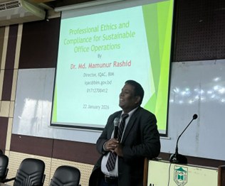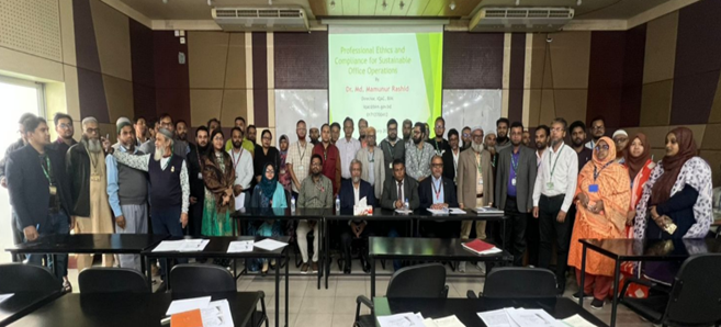 The keynote session of the seminar was conducted by Dr. Md. Mamunur Rashid, Faculty Member (Production Management), Bangladesh Institute of Management (BIM). In his comprehensive presentation, Dr. Rashid discussed the fundamental concepts of professional ethics, organizational compliance, and sustainable office management. He elaborated on ethical decision-making, adherence to institutional policies, regulatory frameworks, and best practices that ensure transparency and accountability in office operations. He also emphasized how ethical compliance supports sustainability by reducing operational risks, improving efficiency, and fostering a culture of trust and responsibility within organizations.